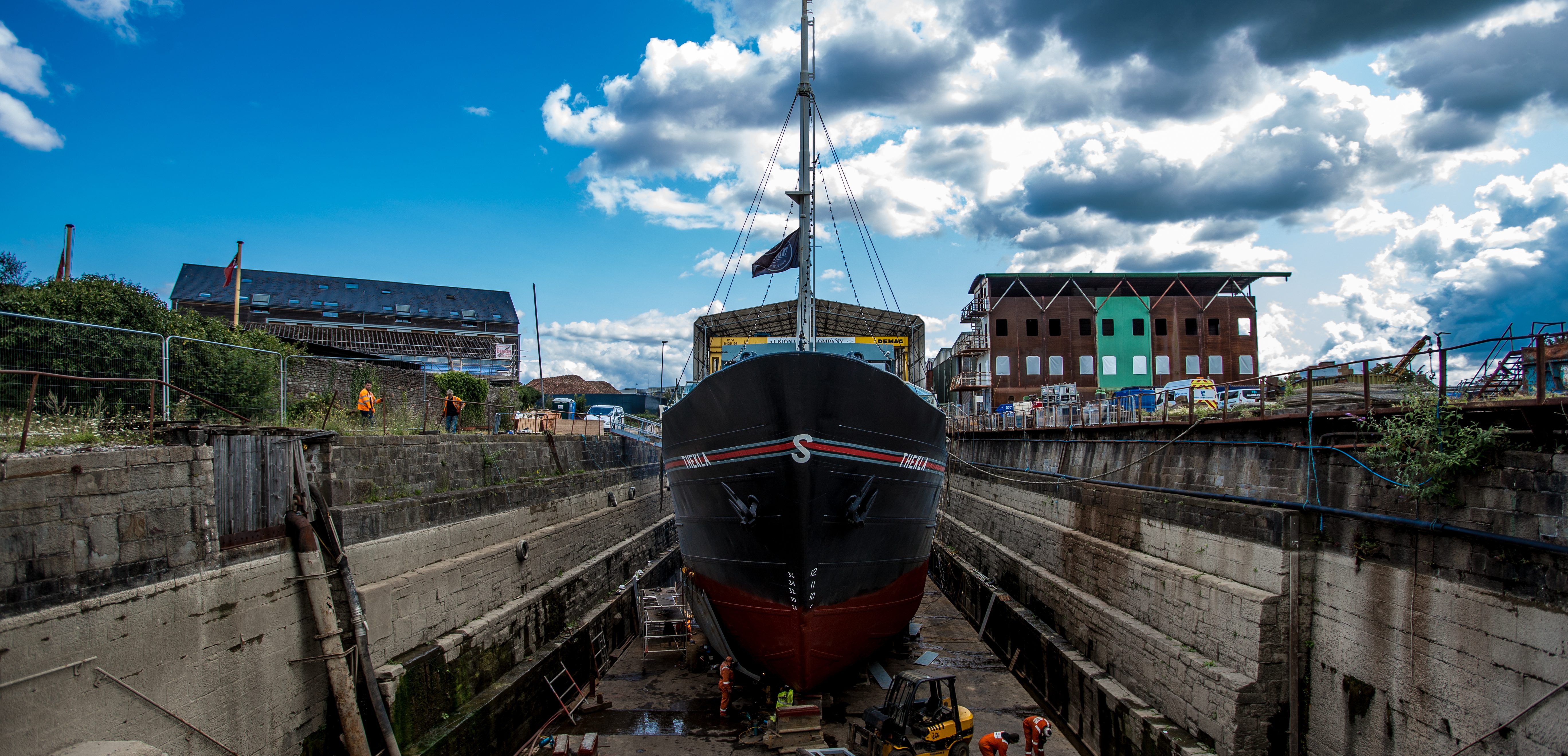 From June to September 2019, Thekla was moved to the listed Albion Drydock for extensive repair works. The result of this is a brand new steel offset hull welded into place around the whole of the existing hull.